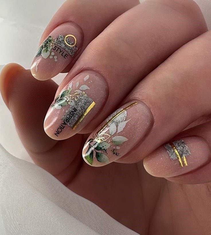 This nail design is a beautiful fusion of past and present. Soft pink bases, translucent glitters, and dainty floral motifs with golden accents create a look that feels both retro and refined. These medium-length oval nails nod to vintage glamour while staying current with modern trends. Ideal for garden parties, bridal events, or brunches, they pair seamlessly with lace dresses and vintage-inspired pieces.