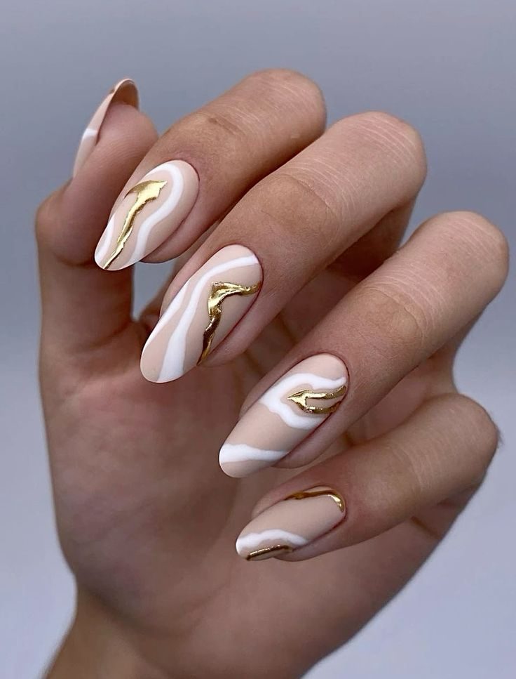 Bring the tranquil rhythm of the ocean to your fingertips with this chic design. Delicate white wave patterns curl across a neutral base, highlighted by shimmering gold foil that mimics sunlight on water. These nails are perfect for summer getaways or breezy beach days. They pair effortlessly with flowing maxi dresses, crisp white outfits, or anything that captures the carefree essence of the sea.