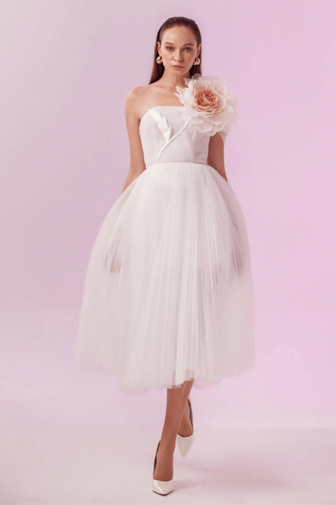 Playful and romantic, this knee-length gown features a dreamy asymmetrical bodice with a single floral accent, adding a gentle boho tone. The light tulle skirt completes the look with airiness and charm. For brides seeking romantic wedding dresses with unique details, this gown offers an ethereal, starlit finish.