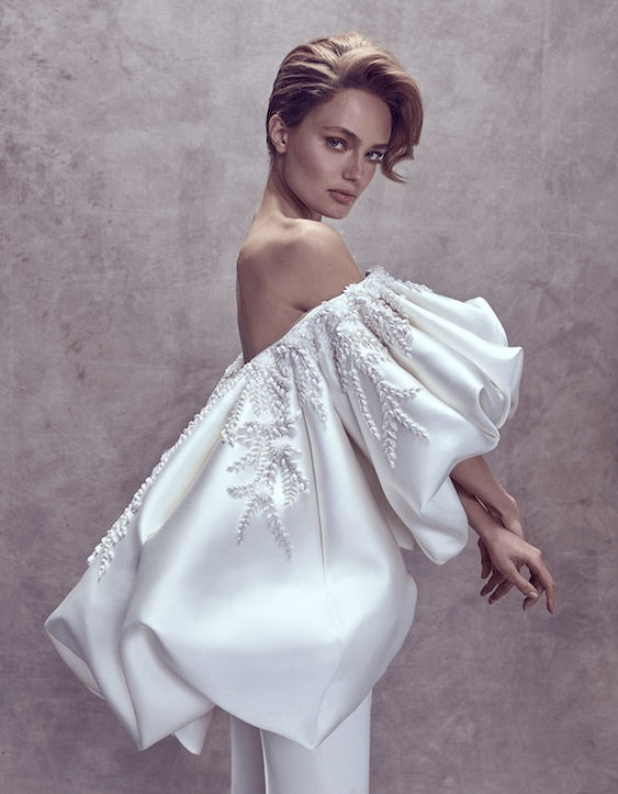 For the bride with a love of drama and distinction, this dress commands attention. A plunging neckline is paired with exaggerated puff sleeves, offering fashion-forward confidence while maintaining classy elegant grace. The structured bodice flows into a full skirt that radiates energy and refinement. This design encapsulates 2025’s empowered bridal fashion trend, where bold meets bridal.