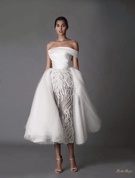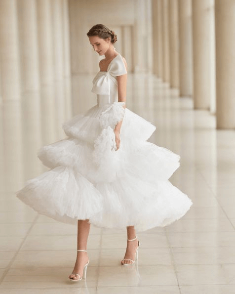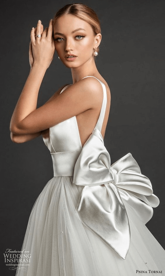 Bold yet refined, this modern elegant wedding dress makes a powerful bridal statement. A sleek satin bodice provides structure and shine, contrasting with the dramatic volume of the knee-length tulle skirt. The pièce de résistance is a striking oversized bow at the back, bringing 2025 bridal trends to life. For brides who seek classy elegant bridal wear with an edge, this look is both unforgettable and photo-ready.