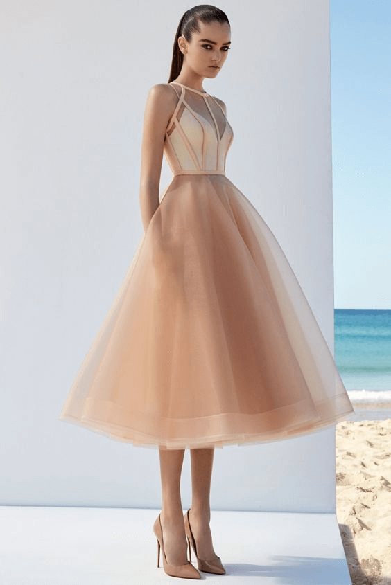 Architectural and airy, this dress captures the imagination. Geometric paneling on the bodice creates structured artistry, softened by a flowing knee-length tulle skirt with a nude undertone that suggests freedom and movement. This gown is ideal for beach weddings or destination ceremonies, delivering modern simple beauty for the free-spirited bride.