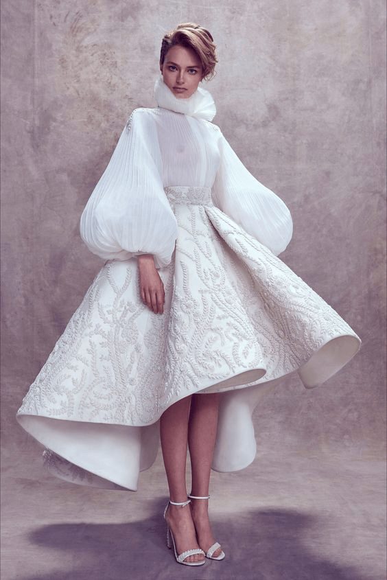 For brides drawn to the artistic side of fashion, this sculptural high-neck gown stuns with dramatic long sleeves and a voluminous lace skirt. The all-white textural interplay is both bold and soft, offering a statement silhouette that feels tailored for gallery settings or nontraditional venues. A dream for those who appreciate modern simple design with vintage bridal detailing.
