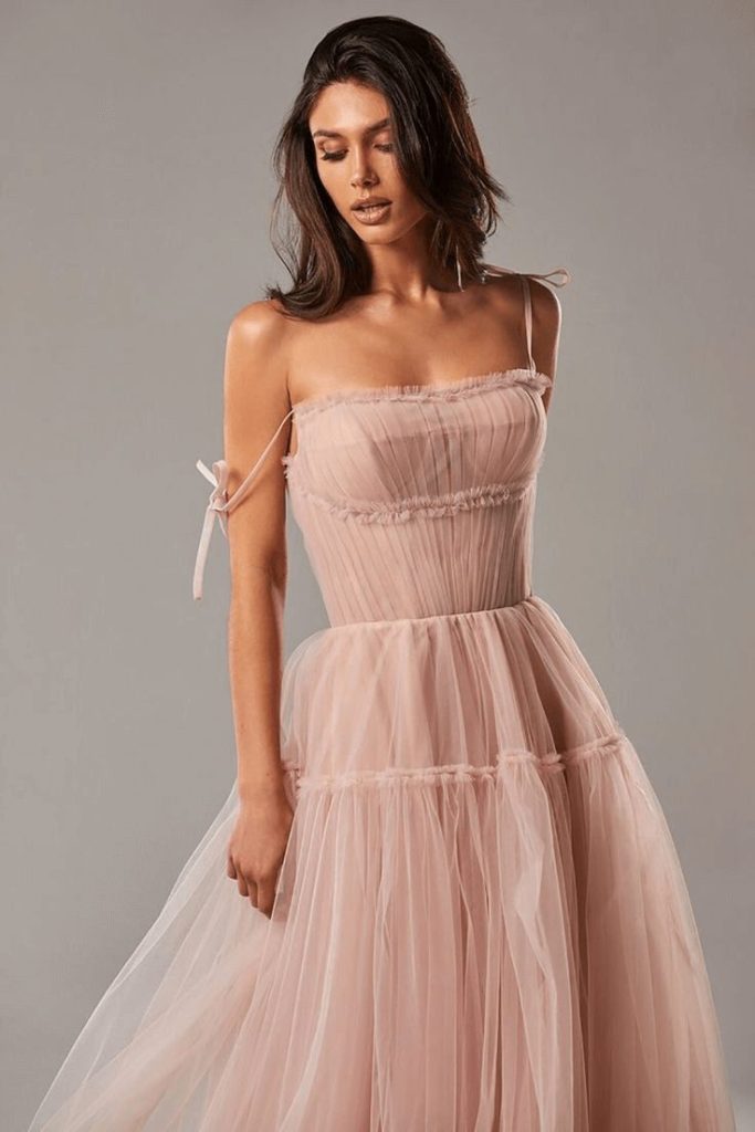 For the bride drawn to softness and subtlety, this blush-hued dress is a romantic dream come true. The ruched bodice enhances the waistline with flattering structure, and the sheer straps lend a whimsical, airy feel. Crafted from multi-layered tulle that ends just at the knee, this gown exudes aesthetic vintage appeal with modern comfort. A perfect choice for an intimate garden wedding or a bride who loves vintage-inspired elegance in a relaxed silhouette.