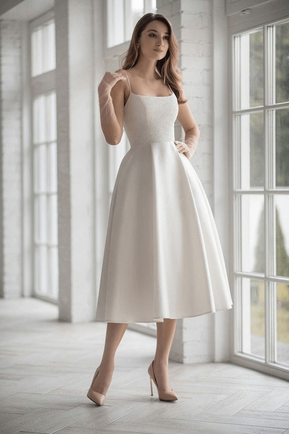 This knee-length wedding dress embodies everything the modern bride desires: comfort, sophistication, and beauty. A sweetheart neckline brings classic bridal appeal, while the delicately beaded waistline adds just enough sparkle to elevate the look without overwhelming its understated charm. The softly flared tulle skirt gently grazes the knees, offering movement and grace that suits a wide variety of body types. A perfect representation of simple elegant wedding gowns for 2025, this design balances ease and refinement—ideal for an outdoor ceremony, civil wedding, or reception.