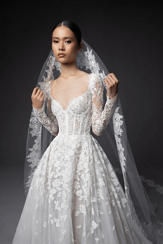 For the bride who values movement and flow, this gown brings lace to life. Long sleeves and an extended train create fluidity, while the tailored lacework adds romantic structure. It’s the perfect expression of modern elegant bridal fashion, refined and full of joy.