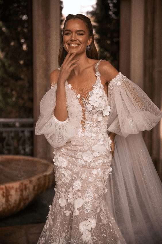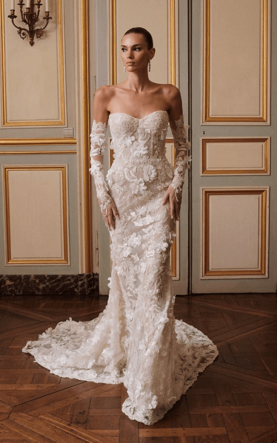 This gown is a masterclass in balance—romantic lace detailing paired with simple modern lines. Long sleeves and floral accents make it a classy elegant option for brides who want timeless grace with a playful twist. It’s the embodiment of feminine charm and thoughtful design.