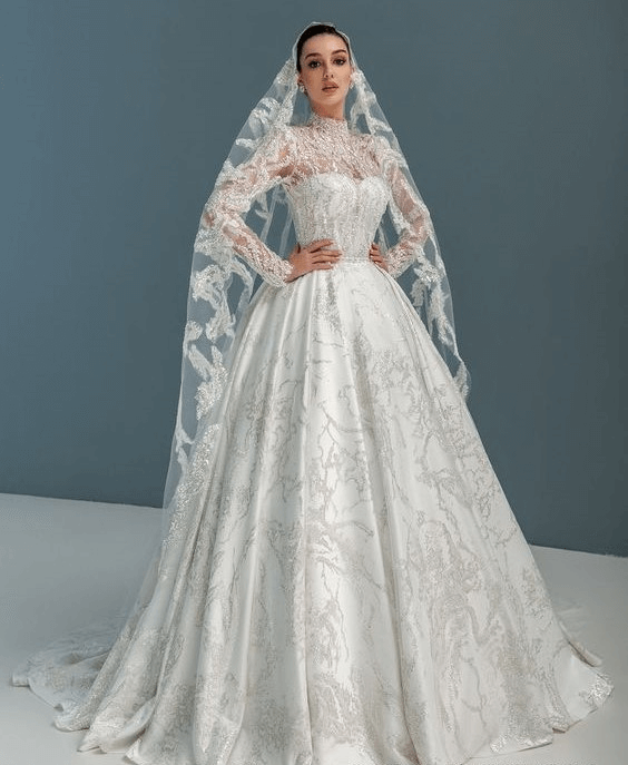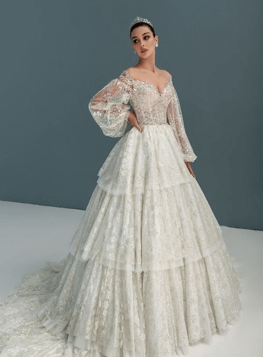 Designed for drama, this voluminous ballgown showcases couture-level lace sleeves and a structured full skirt. For brides who envision classy elegant princess wedding dresses, this gown delivers impact and regality while maintaining modern simplicity in its construction.
