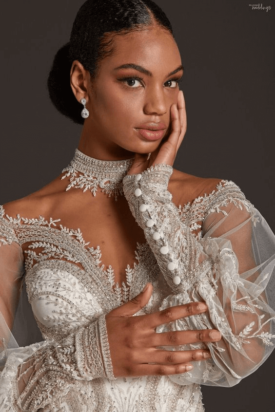 This gown is an invitation into a fairytale. Sheer fabrics, flowing sleeves, and detailed lace create a sense of whimsy and wonder. Designed for the bride who dreams in florals and walks with purpose, this gown merges vintage fantasy with the 2025 trend of free-spirited elegance.
