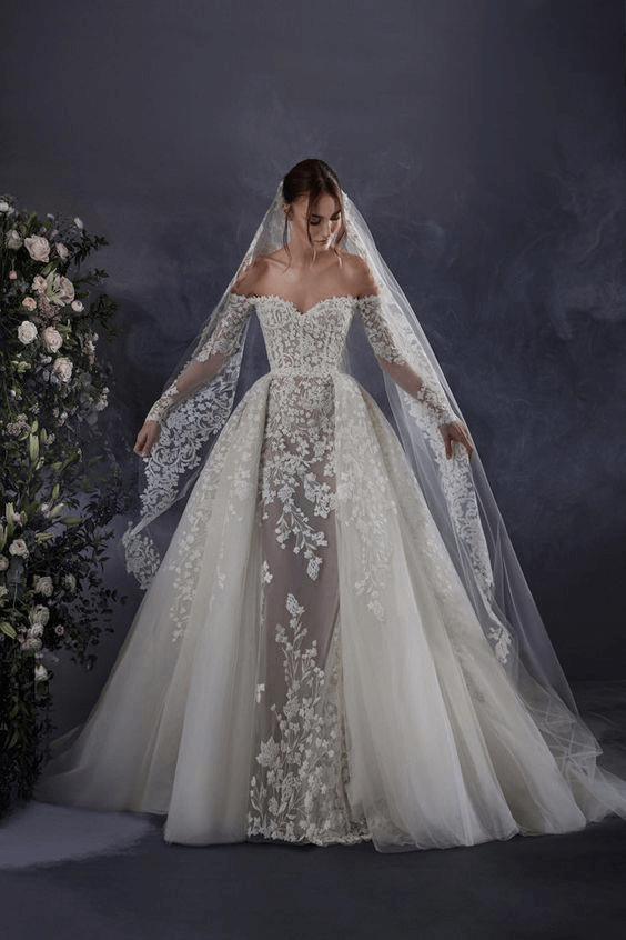 A vision of royal romance, this off-shoulder lace ballgown channels fairytale wedding gown elegance. The sweeping train and intricate appliqués feel both ethereal and majestic. Perfect for brides seeking grandeur and grace, this design epitomizes classy elegant luxury and timeless splendor.