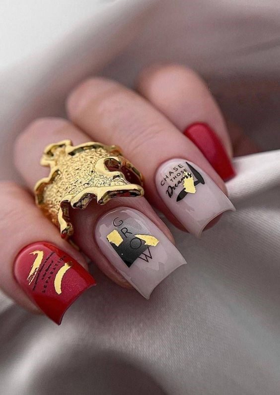 Channel your inner artist with this dynamic red and beige manicure. With bold red shapes and inspirational phrases like “Chase Your Dreams,” these nails are more than just stylish—they’re motivational. Gold foil details lend a luxurious touch, echoing the popularity of gel natural and glitter French designs. Whether your nails are short or long, this look makes a confident statement of ambition, creativity, and glamor.
