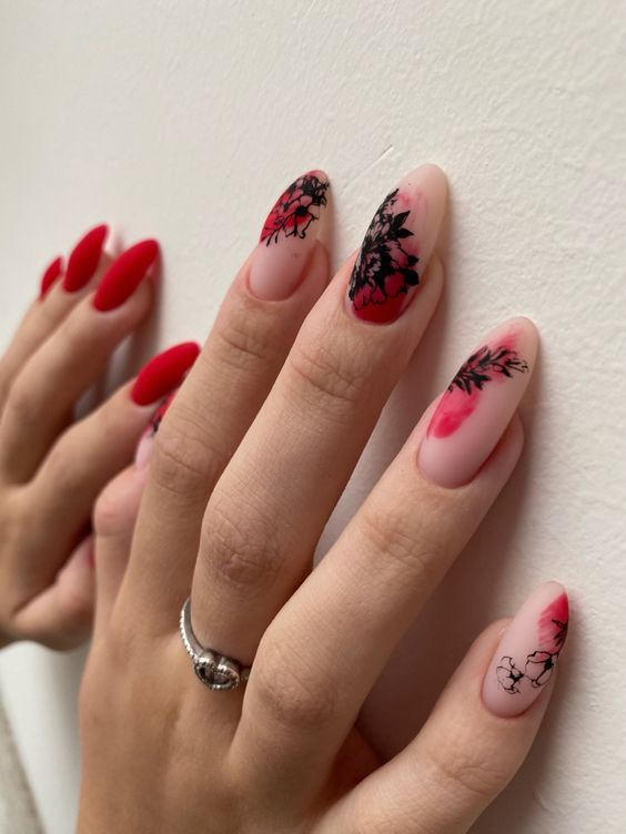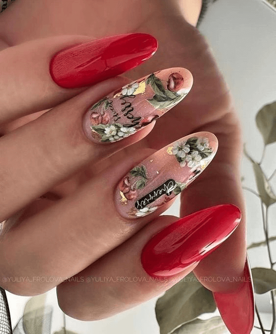 Celebrate summer’s floral richness with a romantic manicure that pairs classic red polish with intricately painted blossoms. Some nails boast a glossy crimson hue for timeless charm, while others feature dainty flowers and leafy accents on a nude base. This design strikes the perfect balance between bold color and nature’s subtle elegance, making it a beautiful option for weddings, garden parties, or just adding charm to your everyday look.