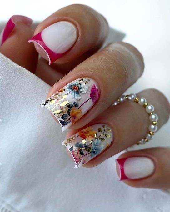 Step into summer with a reinvented classic: the floral French manicure. This updated version features soft pink and white tips accented with delicate, hand-painted blooms set against a translucent base. It’s the perfect marriage of timeless French design and nature-inspired artistry. Suitable for both short and long nails, this look exudes elegance and freshness, making it a versatile choice for beachside brunches or evening soirées.