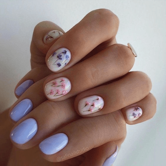 Short nails can be just as expressive as longer styles, and this blush pink base with delicate floral detailing proves it. Each nail serves as a gentle nod to nature’s awakening, with dainty petals and fine lines evoking the quiet beauty of a spring meadow. This look is ideal for women who appreciate refined, romantic details.