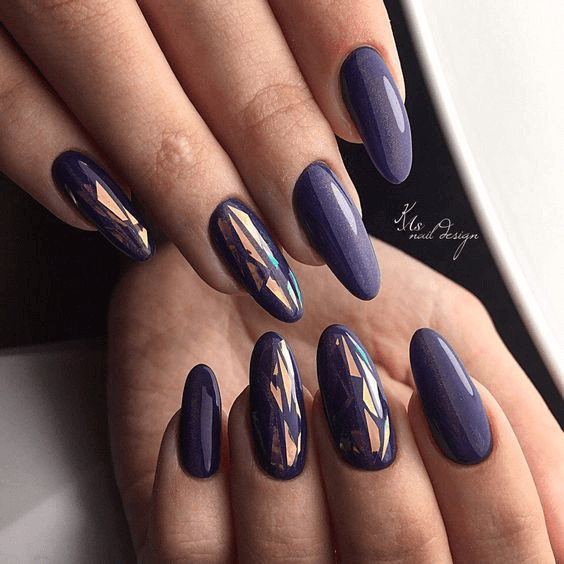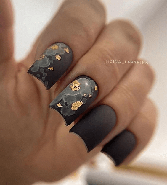 These dark square nails are enhanced with golden crescent moons and tiny stars, giving the manicure a celestial twist. The contrast between the matte midnight hue and shiny metallic art makes this look magical and sophisticated.