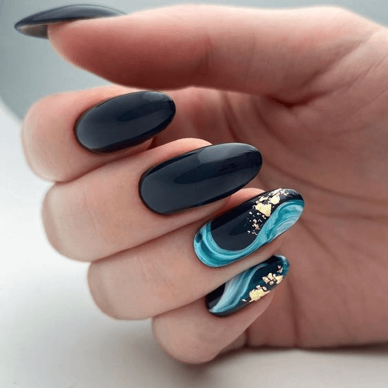 Blending deep blue and aquamarine swirls with golden shimmer, this design feels like a dive into magical spring waters. Each nail glistens like the surface of a lake, making this manicure as poetic as it is fashionable.