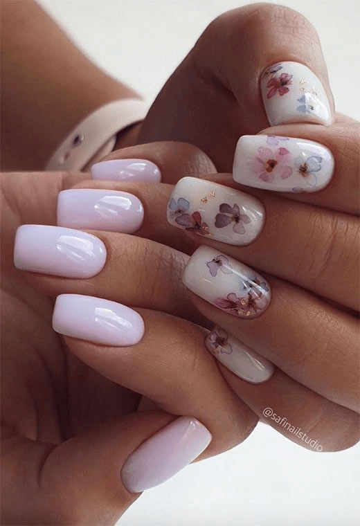 These acrylic square nails layer lavender and white with intricate flower motifs that feel airy and delicate. It’s a peaceful, polished look perfect for ushering in the season of new beginnings.