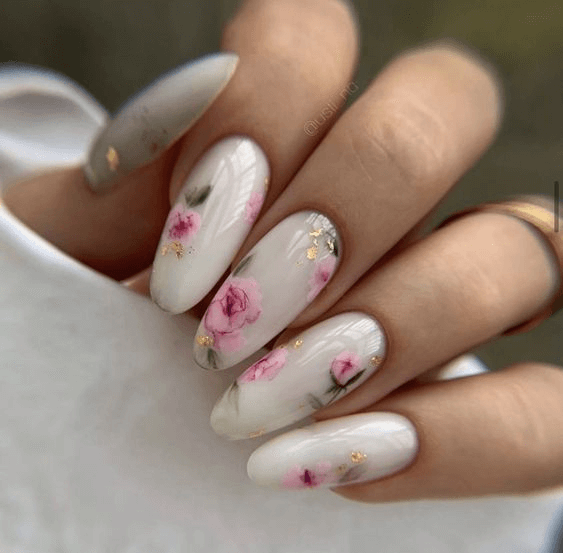 With petals that appear to bloom across the nail surface, this blush pink almond set is an ode to nature’s awakening. The gold leaf accents bring a luxe touch to an otherwise soft and romantic design, ideal for garden parties or daytime dates.