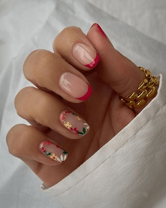 Bright, cheerful, and packed with seasonal charm, these gel nails combine a lively pink base with detailed spring florals on a crisp white backdrop. The floral accents bring a whimsical, garden-inspired touch, while the bold pink adds personality and energy—perfect for March’s transition into longer days and blooming landscapes.