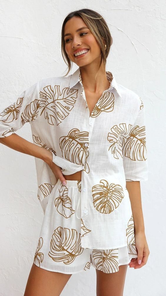 A white linen shirt featuring botanical prints paired with coordinating shorts introduces nature-inspired minimalism into your summer lineup. Ideal for garden parties or weekend markets, this earthy-toned ensemble offers a sustainable and stylish approach to capsule dressing.