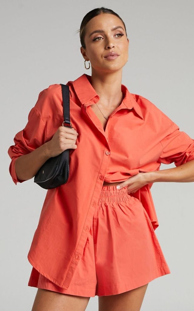 Bright coral tones shine in a coordinated shirt and shorts set that embodies comfort and vibrant style. With clean cuts and lightweight fabric, it’s the perfect balance between bold color and minimalist design. This set suits everything from beach walks to relaxed work environments.