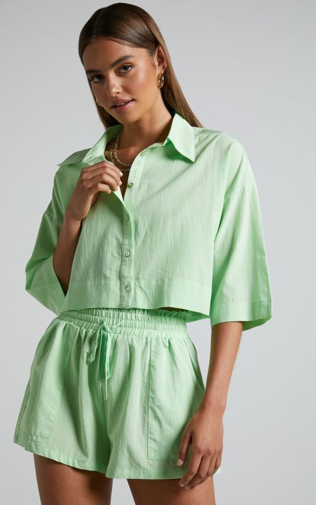 Cool and breezy, a mint green co-ord set of shirt and shorts offers a refreshing take on summer basics. Ideal for casual days or road trips, this set is an easygoing and chic option for your travel capsule. The soft color enhances its minimalist appeal, bringing calmness and style into your summer wardrobe.