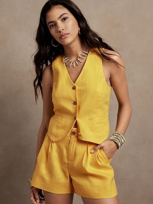 A mustard yellow romper captures the golden warmth of a summer sunset. With a sleek silhouette and sleeveless design, it’s a bold yet minimalist option for evening events or polished daywear. This piece offers statement color without compromising on the clean aesthetics of a capsule wardrobe.