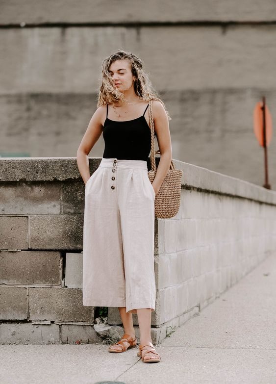 Linen wide-leg trousers paired with a sleek black tank top make for a timeless combination. This look prioritizes breathability, comfort, and effortless elegance—making it a favorite among women 30s and up. Button details on the pants and a structured silhouette add depth to the otherwise simple ensemble, perfect for both travel and work settings.