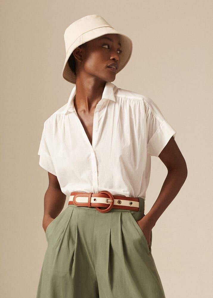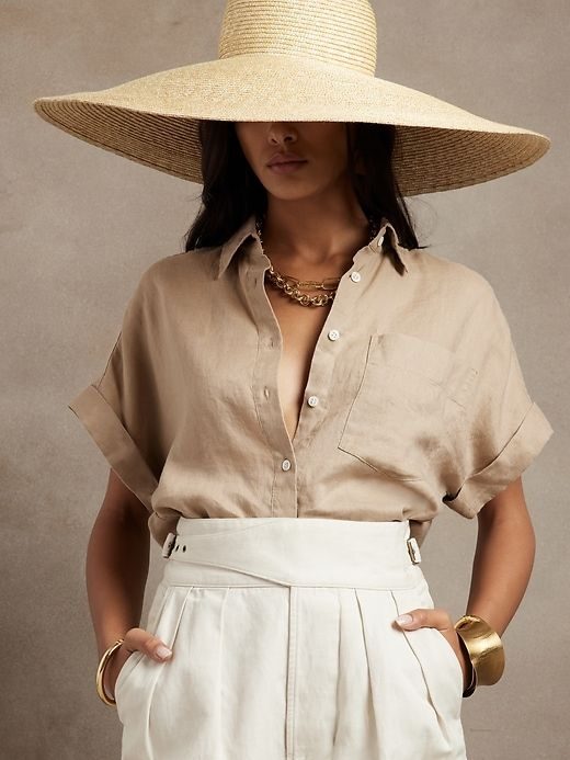 This look combines a short-sleeved khaki shirt, high-waisted linen pants, and an oversized sun hat for a refined summer aesthetic. It’s equal parts stylish and functional, making it a staple for city walks or weekend getaways. The structured silhouette and monochrome tones elevate this classic outfit into a capsule essential.