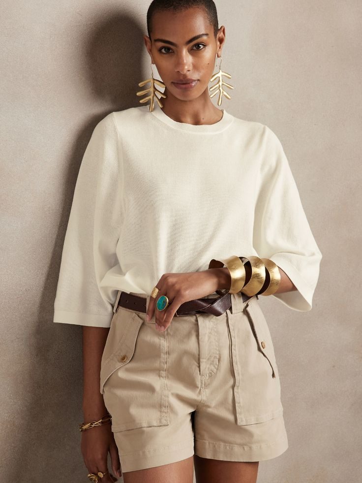 The white tee is the unsung hero of every minimalist wardrobe, and in 2025 it takes center stage with upgraded texture and a relaxed fit. Worn with khaki shorts and punctuated with bold gold accessories, this look champions capsule summer essentials. The combination of white and khaki remains timeless and effortlessly aligns with minimalist color palettes. Whether you’re heading out for vacation or enjoying a casual city stroll, this pairing proves that understated classics are anything but boring.