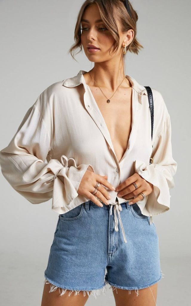 The pairing of a flowy silk blouse with rugged denim shorts exudes relaxed sophistication. Tied sleeves and unbuttoned details add character to this classic combo, offering the perfect outfit for travel or creative office settings. The balance of textures makes it a summer go-to that aligns with both comfort and elegance in minimalist dressing.