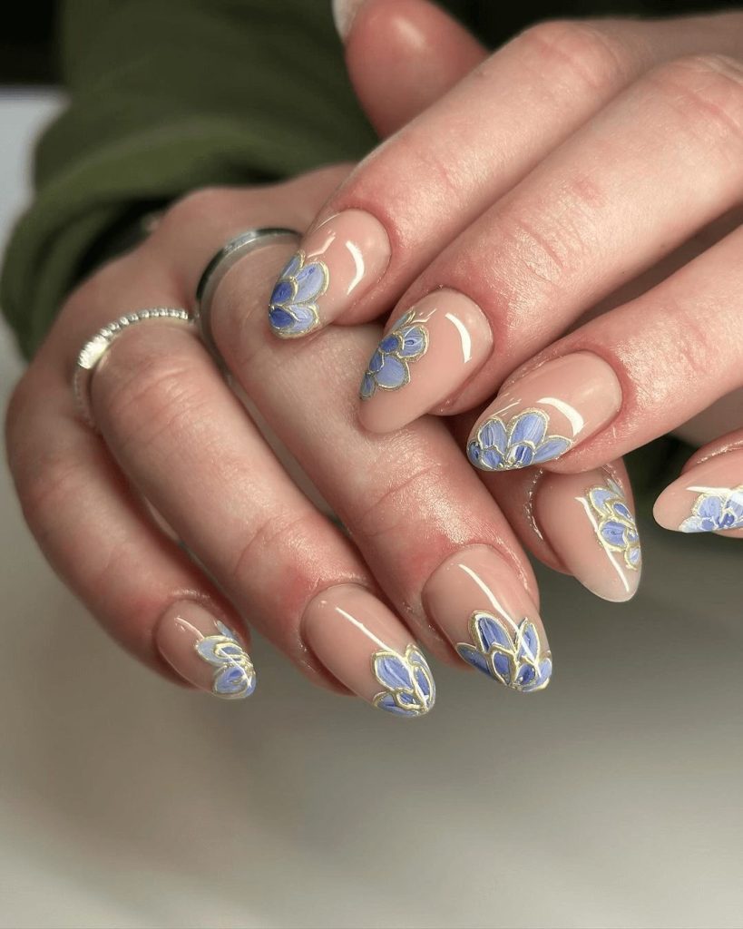 Nature-inspired designs are flourishing in 2025, and this manicure brings them to life with intricate blue botanical patterns on a nude base. The deep blue illustrations stand out beautifully, while delicate gold lines add sophistication. The look is refined yet playful, making it a standout choice for the season.