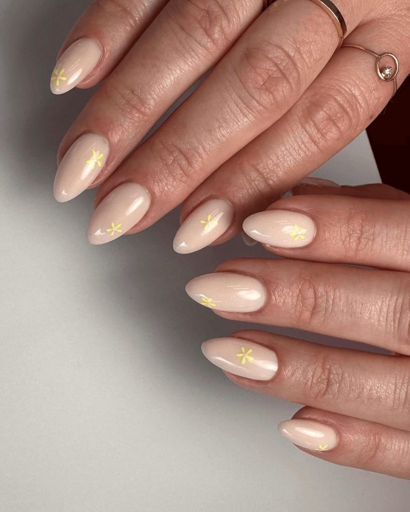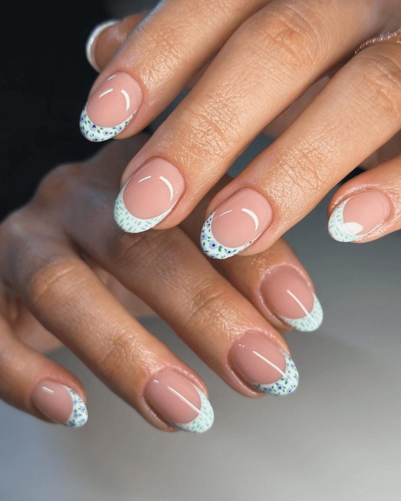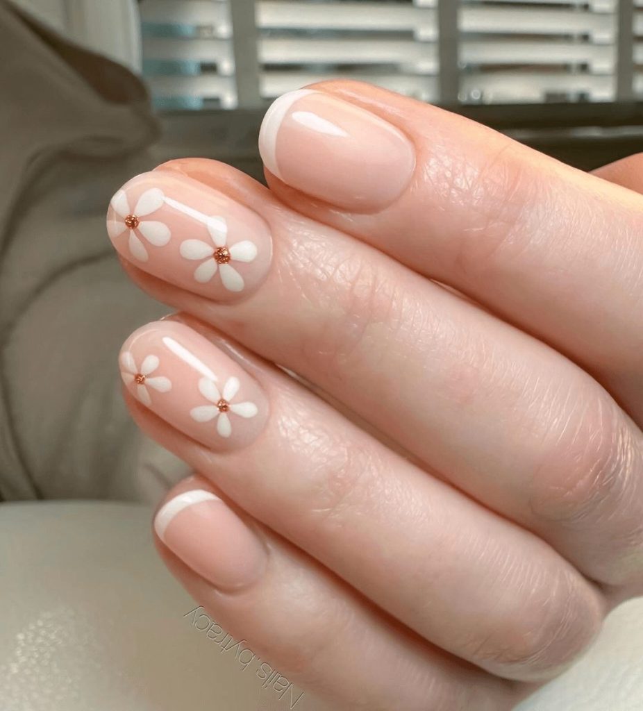 For those who prefer subtlety, this design uses muted tones and fine details to create a delicate summer look. A soft nude base is decorated with small floral accents in pale pink and white, offering just enough detail to make the design interesting without being overwhelming.