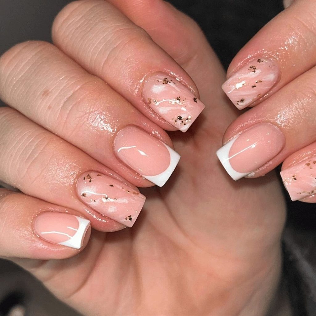 At home, start with your natural base and carefully paint the French white tips. While the polish is still tacky, sprinkle fine gold glitter over the tips for a dazzling accent. Finish with a glossy top coat to lock in the sparkle. The result is a manicure that blends tradition with trend, keeping you shining all season long.