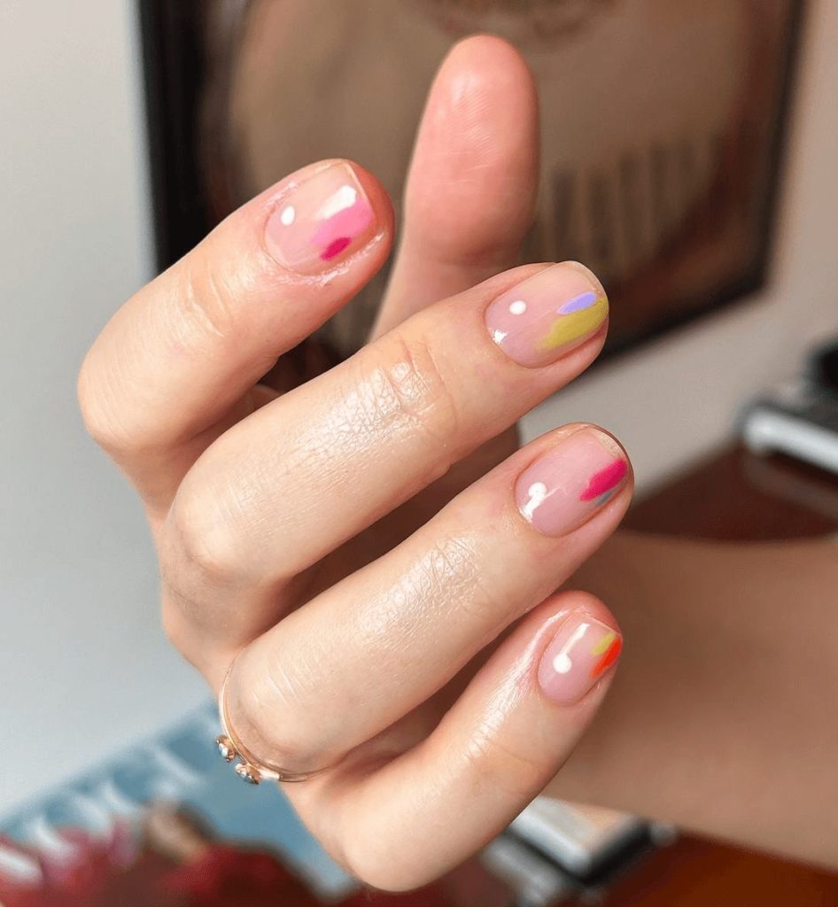This design is particularly flattering on very short nails, proving that length isn’t required for bold style. To try it at home, apply a sheer clear base, then add small dots of color with a brush, slightly blending them at the edges for a dreamy, blurred look. Seal it with a glossy gel top coat for a design that feels fun, fresh, and vibrant all season long.