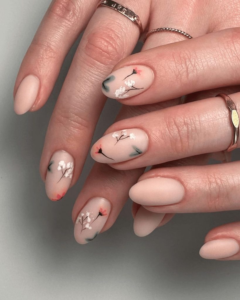 This look is perfect for long nails, where the extra length allows for more intricate detailing. Apply your base coat, then carefully paint small blossoms with a fine brush. A matte top coat adds a modern touch, keeping the overall look soft, romantic, and effortlessly chic.