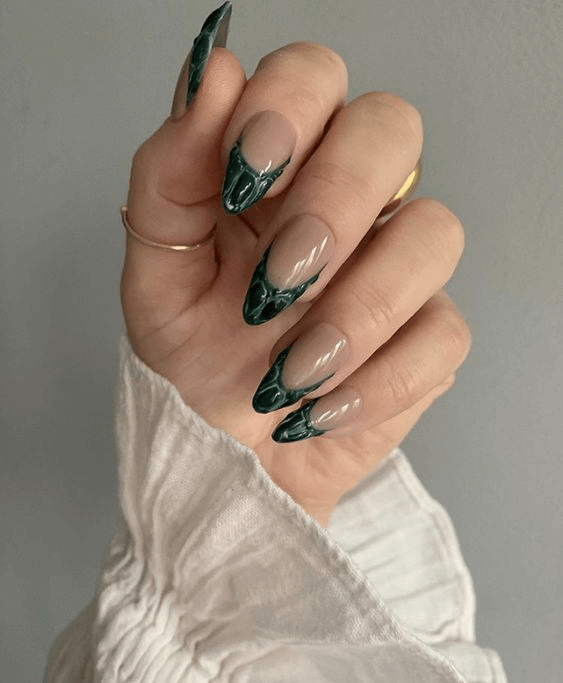 Channel the depths of the ocean with swirling iridescent green and black gel nails. This mysterious, medium-length set reflects Pisces’ water element and fluid emotions. With its edgy elegance, it’s a striking manicure for baddie-themed birthday parties or glamorous March evenings where you shine like the moonlit tide.
