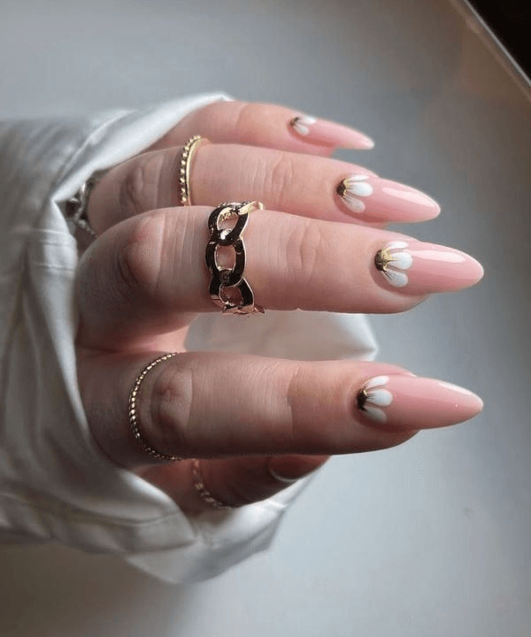 Elegant and refined, these almond-shaped gel nails feature a pale pink base decorated with delicate botanical designs in contrasting hues. Perfect for special gatherings or a sophisticated baddie birthday look, this manicure reflects Pisces’ connection to subtle beauty and signs simple aesthetics.