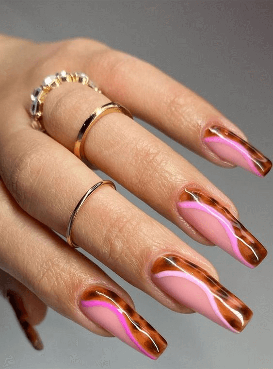 Showcasing the fiery heart beneath Pisces’ gentle exterior, this coffin-shaped set swirls bold pinks with molten marbling. Using gel techniques to create fluid patterns, these nails reflect your passionate side. They’re the perfect companion to any birthday bash or fashion-forward baddie event.