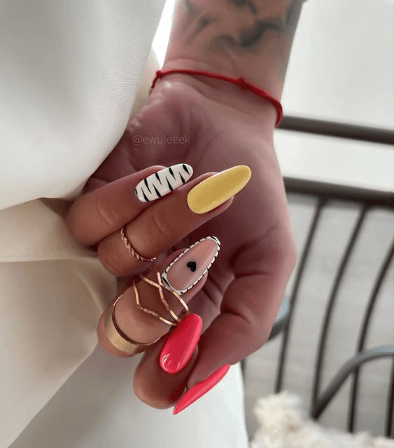Mysterious and mesmerizing, this design features a captivating eye motif paired with a mix of monochrome gel and red acrylic sparkle. The blend of almond and coffin nail shapes reflects Pisces’ layered personality—part soft-spoken mystic, part fierce goddess. It’s a dramatic set for those who embrace all facets of their zodiac identity.