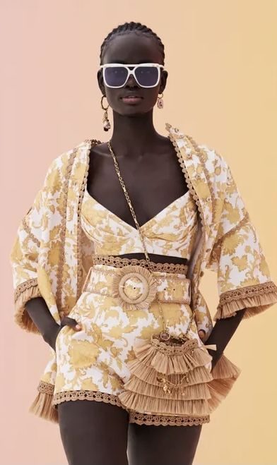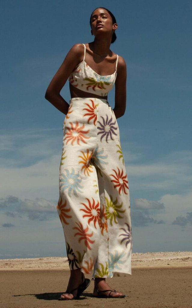 A printed two-piece set glows with golden tones, offering a refined beach-ready look. The playful crop and flowy bottoms make it ideal for seaside brunches or strolling along the coast. It’s both casual and sophisticated, blending simplicity with high-fashion vibes.