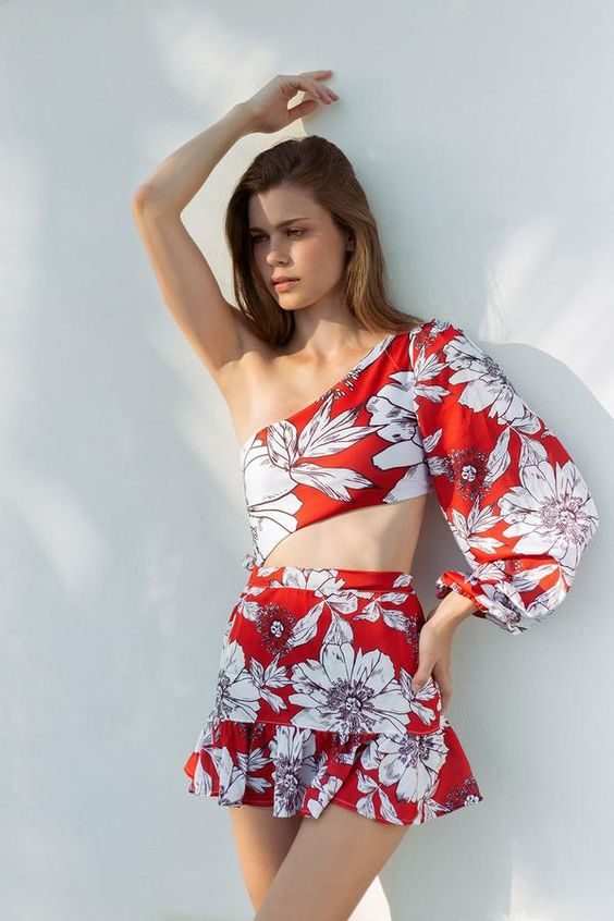 Red and white tropical prints come alive in this playful one-shoulder top and skirt set. Voluminous sleeves and bold patterns create an eye-catching ensemble for festivals, vacations, or city adventures. It’s trendy, vibrant, and a brilliant blend of street-smart fashion and feminine energy.