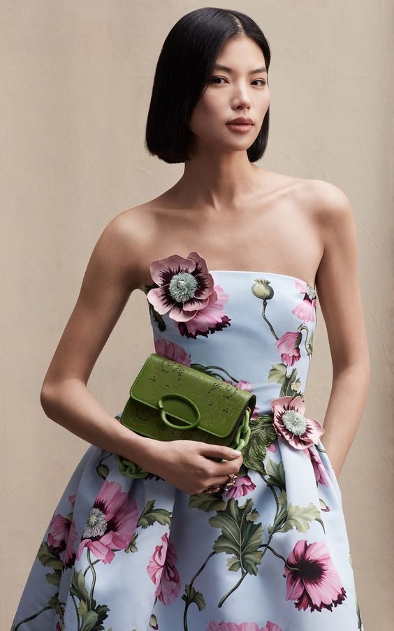 Oversized florals bring the classic European summer to life in this strapless gown with a full, twirl-worthy skirt. Tailored to perfection, the design is an ode to romantic fashion houses like Ralph Lauren. This aesthetic works seamlessly for garden events, formal luncheons, or alfresco dining under twinkling lights—timeless, graceful, and captivating.