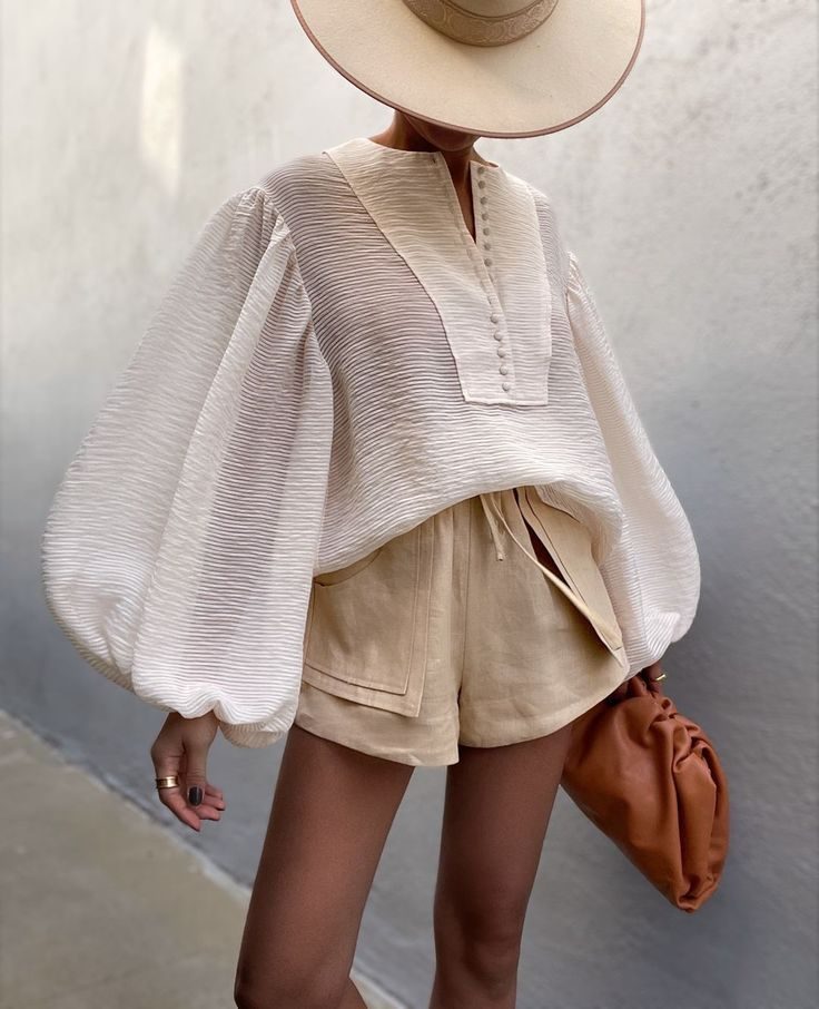 Subtle texture takes center stage in this lightweight blouse and shorts pairing. A wide-brimmed hat completes the look, perfect for sun protection and chic minimalism. Ideal for exploring Stockholm or enjoying quiet moments at a beach café, this outfit embodies functional elegance and simplicity.