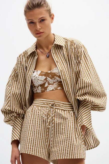Scandi simplicity shines in this relaxed striped set. A botanical print bralette adds interest beneath a loose-fitting jacket and matching shorts, creating a casual yet elevated aesthetic. It’s ideal for sunny days in Copenhagen or chic sightseeing adventures. The look delivers comfort without compromising on cool factor.