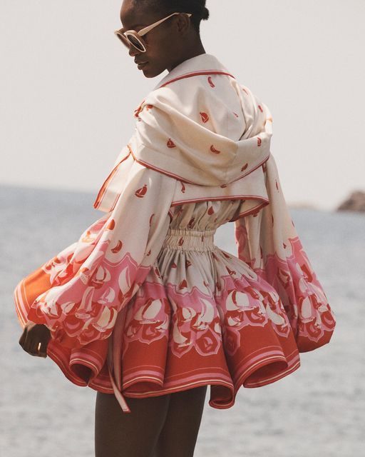 This coral-hued silk dress captures the romance of summer’s golden hour. With voluminous sleeves and delicate heart motifs, it’s the epitome of breezy sophistication. Perfect for beachside walks or elegant outdoor dinners, this look sings with the light, airy elegance of Riviera fashion.