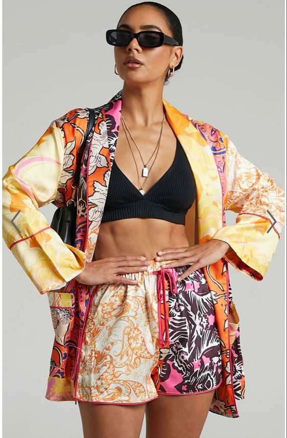 Bold prints meet classic cuts in this eye-catching jacket paired with a simple crop top and shorts. Perfect for city breaks and summer street style, this outfit balances form and function, giving off a confident, creative vibe. It’s the epitome of wearable art for everyday chic.