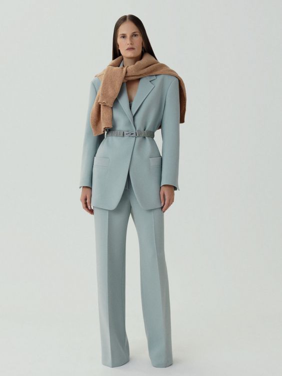 A powder-blue tailored suit paired with a warm scarf embodies the refreshing palette of spring 2025. The soft hue brings brightness and approachability to business attire, while the thoughtful layering makes it seasonally functional. This smart casual outfit bridges professional needs with creative expression.