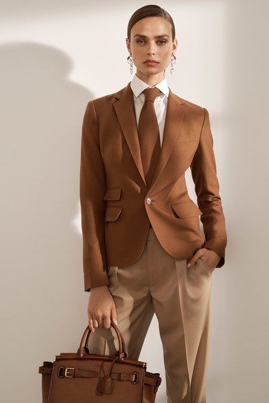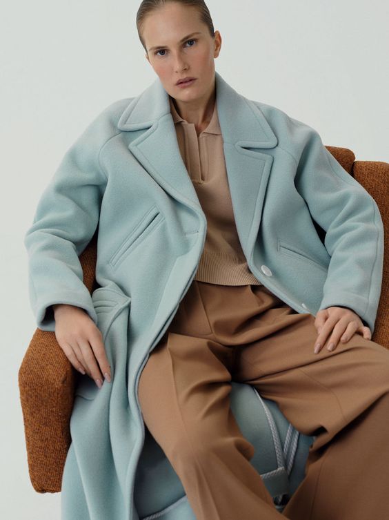 For women who adore the soft serenity of pastels paired with tailored design, this outfit is a spring 2025 standout. A pale blue coat elegantly layers over a beige turtleneck and wide brown trousers, creating a beautiful balance of color and texture. Ideal for the transitional season, this look radiates professional polish while embracing warmth and comfort. Perfect for office wear capsule wardrobes, this ensemble is equally suited to business casual environments or an early spring lunch date.