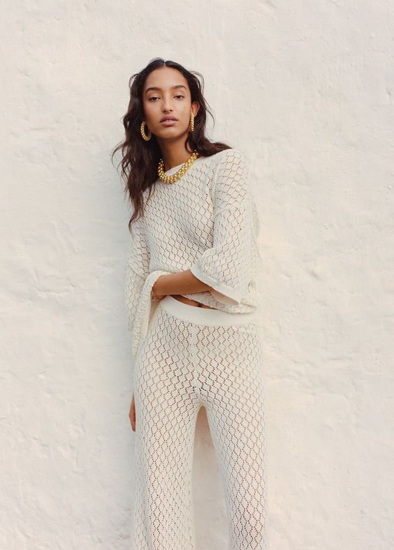 Celebrate artisanal texture with this crochet-inspired white ensemble that pays homage to Mediterranean craftsmanship. A matching top and pants in breathable fabric provide the perfect canvas for bold accessories, like gold jewelry or a silk scarf. Whether you’re sailing on a spring cruise or attending a chic outdoor event, this outfit embodies refined comfort and worldly sophistication—an essential for elegant travel wardrobes in 2025.